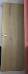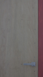 Feel the surface of the wood and breathe in the smell of wood. Follow the grain of the wood, the imperfections, the differing tones in the colour and experience the pleasure that comes from noticing these things. Feel that strangely soft surface with your hands; the soft fuzz not yet flattened by the varnish to come – like the soft facial fuzz of your skin; consider the colour and its variations; become aware of the structure of its build, the line of screw heads that mark out the frame that lies between the skin of the ply. Let the size of the hinges hint at the weight they hold. The hinges are magnificent, they are large, their beautiful throat is large. They make their own statement. The rectangular handle in satin steel complements the hinges. Notice the height of the handle. It is not set at regulation height and you must consciously raise your arm a little in order to use it. Perhaps it positions you differently in relation to the door, reminding you that a door is a tactile thing.
