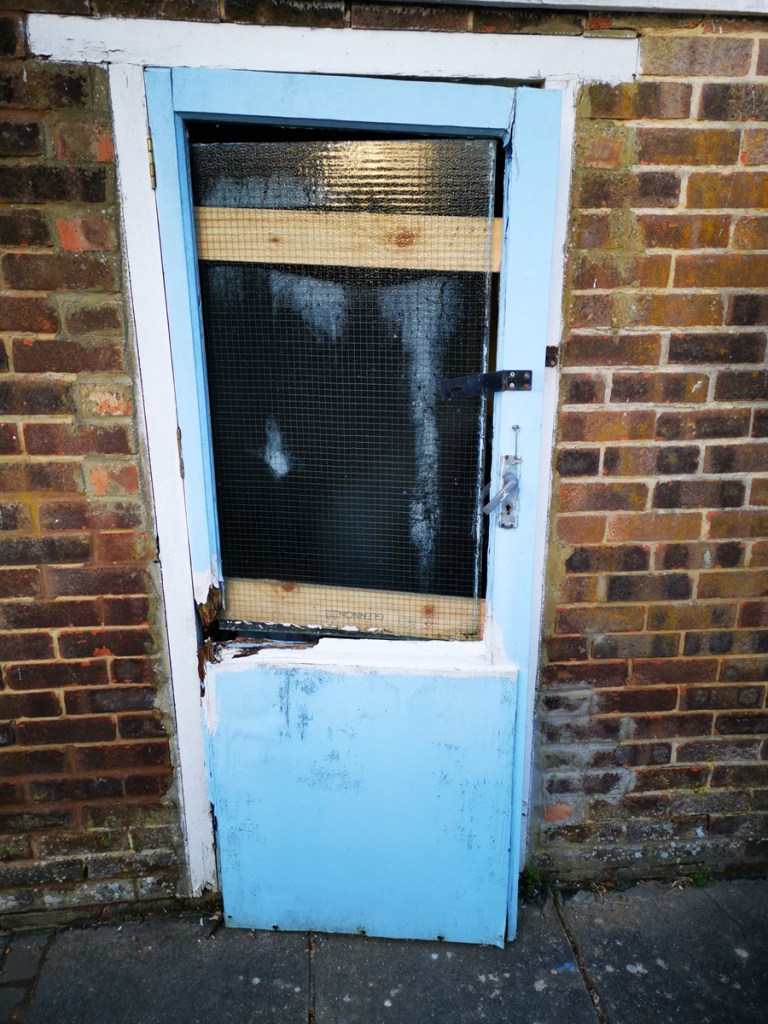 On this occasion the answer was a definite no. A replacement was fitted, I used an exterior ply flush fire door not only are they cheaper than most exterior doors they are also pretty well bullet proof when it comes to wear and tear. Most suitable for garage side doors and the like