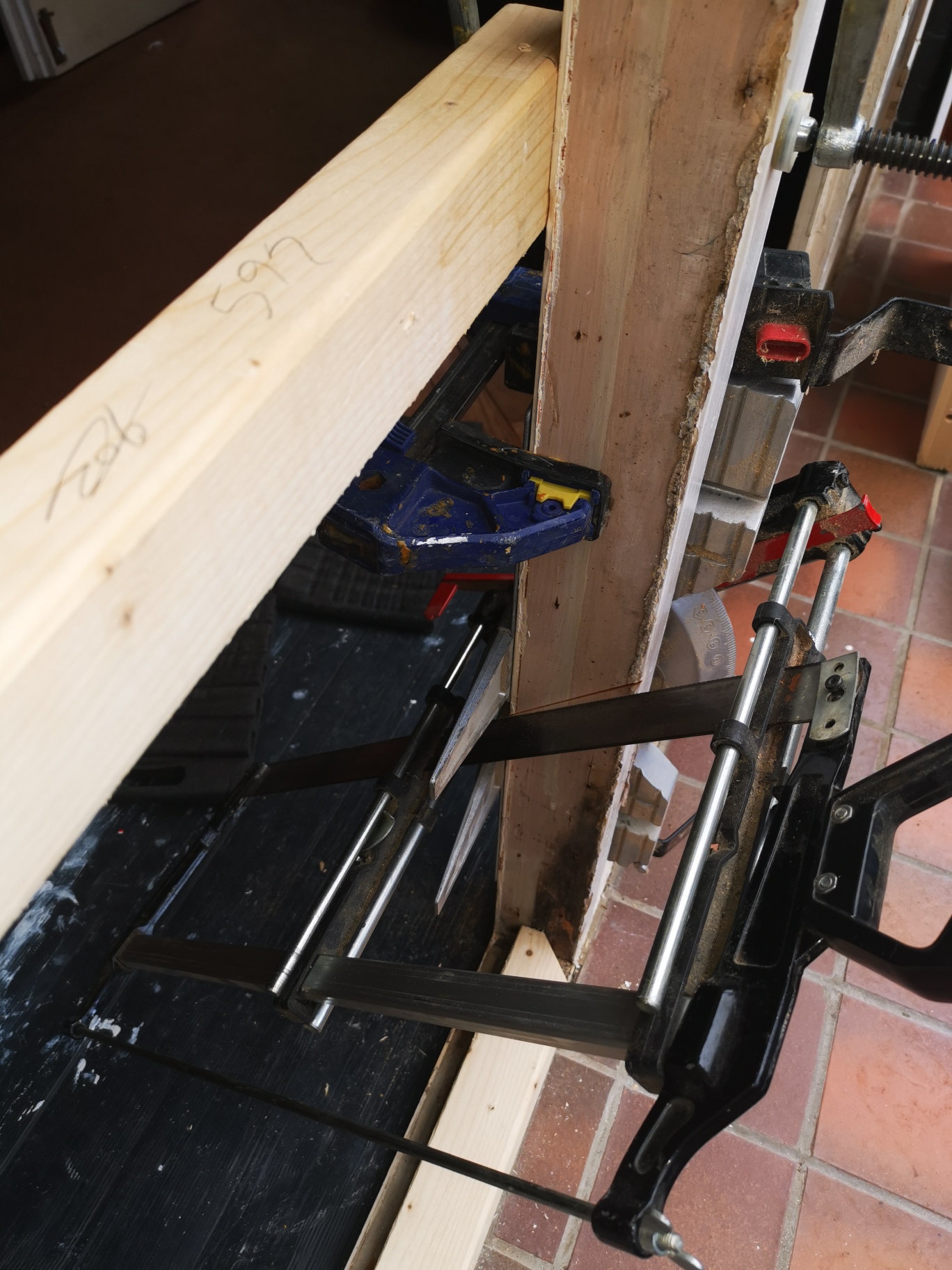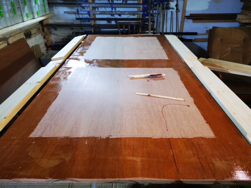 Even if this movement is not so visually apparent the process eventually results in the fastenings working loose. This being the case with these doors along with rot to the bottom third. So to overcome this I went down the route of laying the frame onto 18mm Marine Grade plywood which is pretty well bullet proof when it comes to movement and future rot issues. This method is often employed on board ships and larger vessels where a TGV boarding effect is desired often on dog houses and the forward facing section of wheel houses without having to deal with movement issues which would be exaggerated in a marine environment.